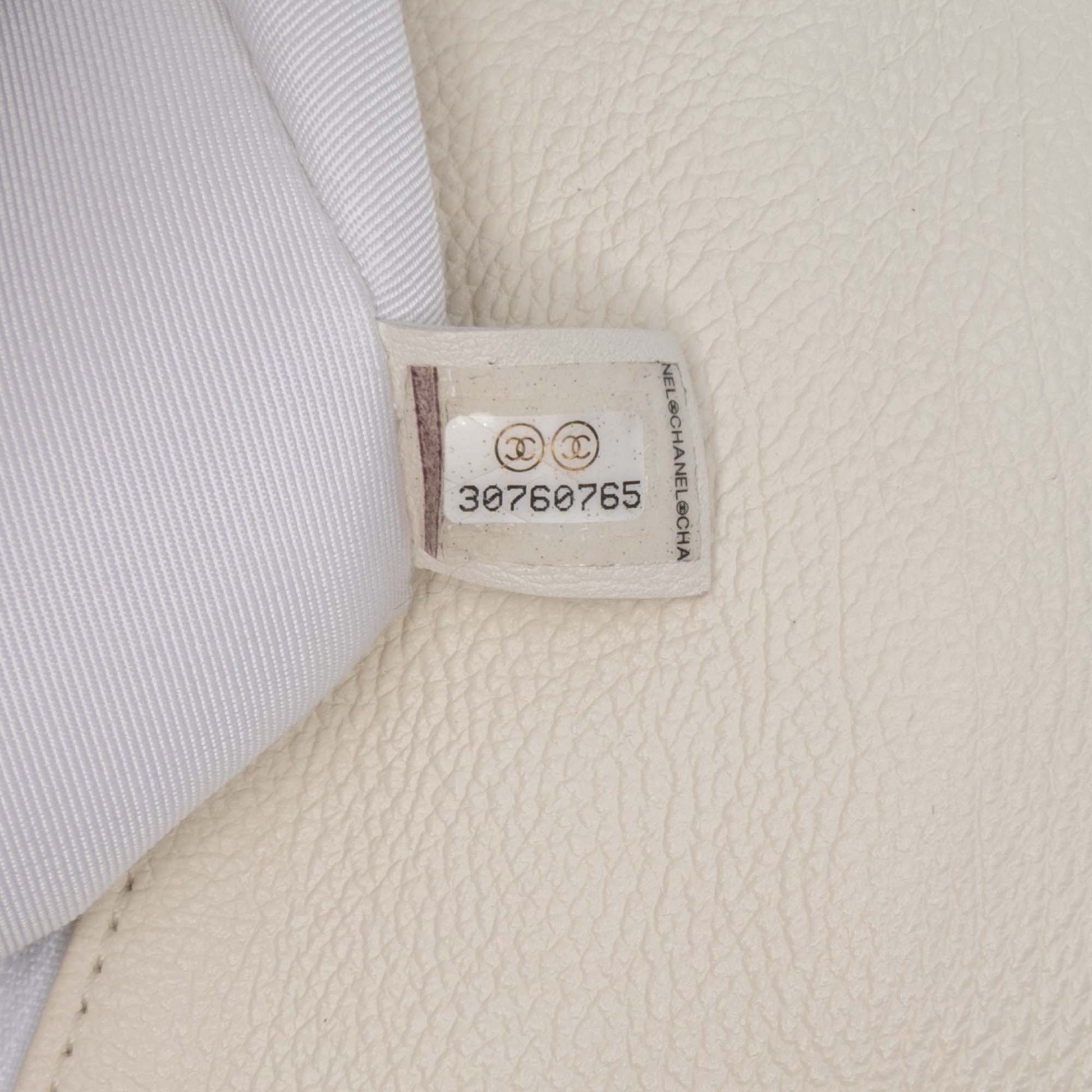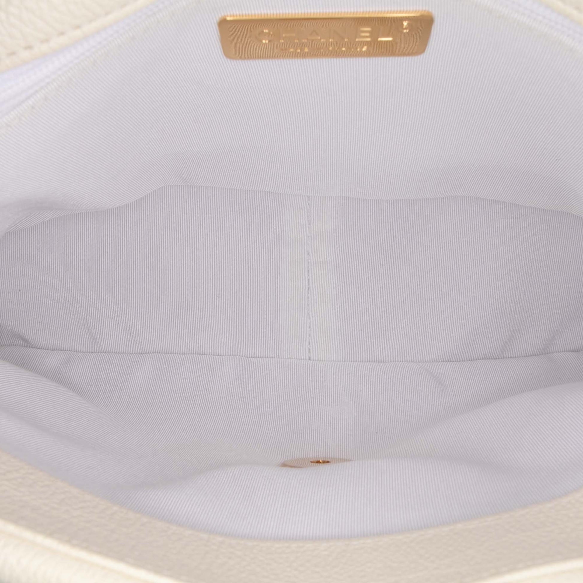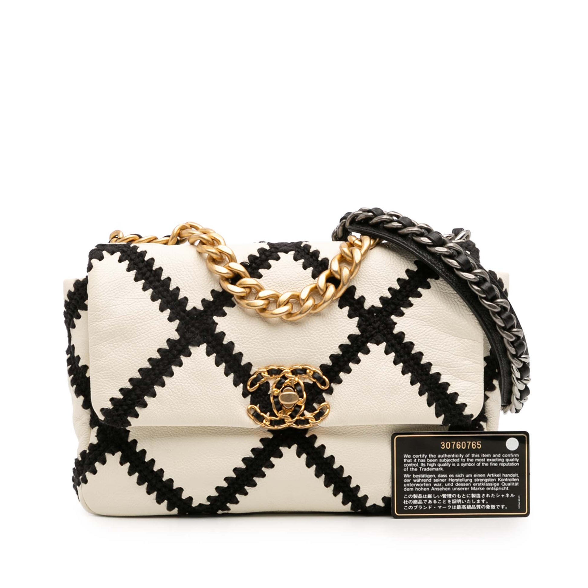 This 19 Flap bag features a quilted calf leather body with crochet stitching details, a curb chain handle, a woven leather chain shoulder strap with leather shoulder guard, a front flap with twist-lock closure, an exterior back slip pocket, and an interior zip pocket. Product Condition Details: Exterior Back Creased. Exterior Back stained with Other. Lock Scratched. Exterior Front Creased. Exterior Handle Worn. Interior Pocket stained with Other. Interior Lining Creased. Interior Lining stained with Other. Exterior Pocket stained with Other. Practical Attachment Rusty/Tarnished, Scratched. Zipper Rusty/Tarnished, Scratched. Inclusions: Authenticity Card. Country of Origin: FRANCE. Serial Number: 30760765