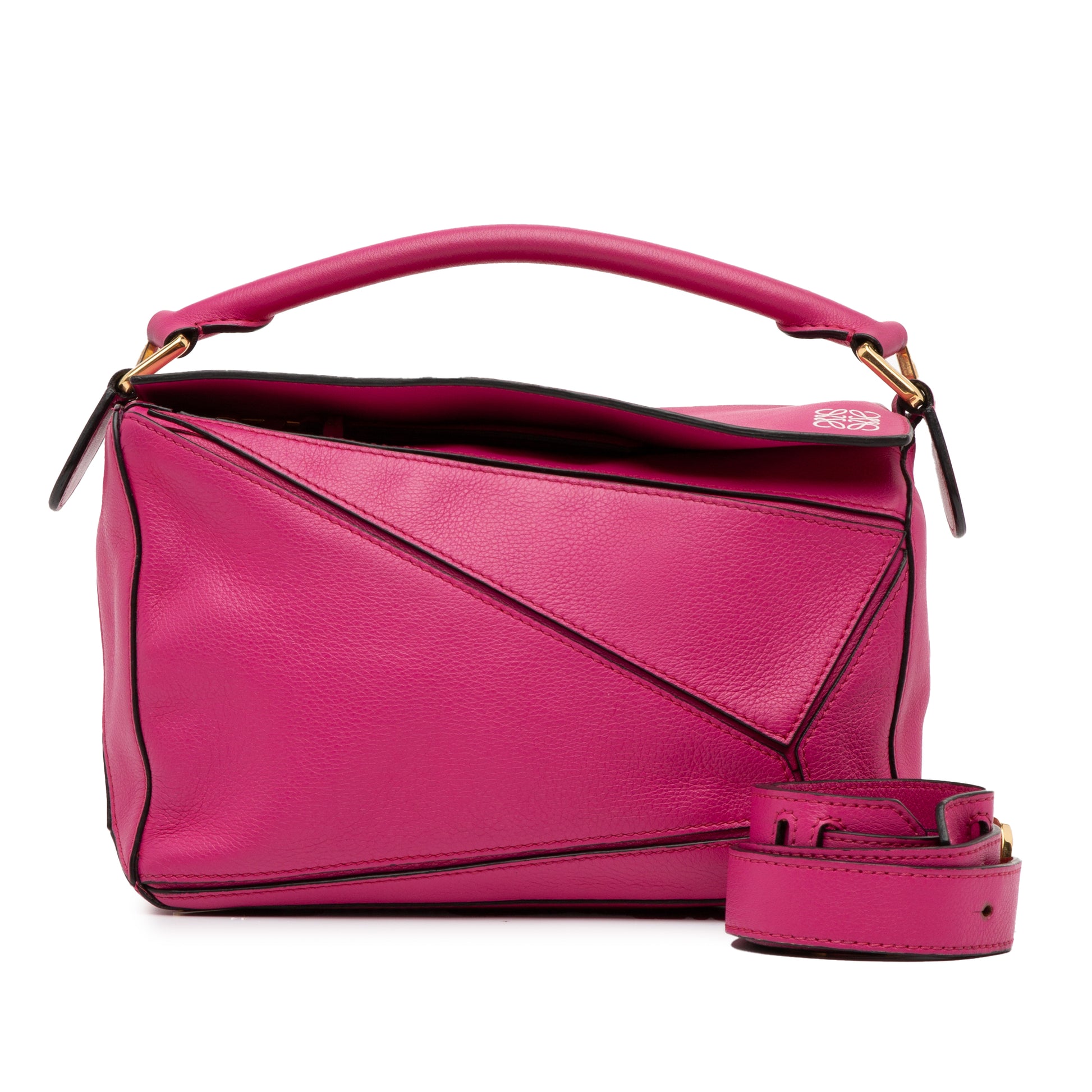 The Puzzle features a leather body, a rolled leather top handle, an adjustable and detachable flat leather strap, a top flap with a zip closure, an exterior zip pocket, and an interior slip pocket. Product Condition Details: Embellishment Scratched. Exterior Handle Out Of Shape. Exterior Handle stained with Transfer Of Color. Interior Lining Discolored, Worn. Practical Attachment Rusty/Tarnished, Scratched. Exterior Side Out Of Shape. Inclusions: Shoulder Strap, No longer comes with original accessories. Country of Origin: SPAIN. Serial Number: 011609